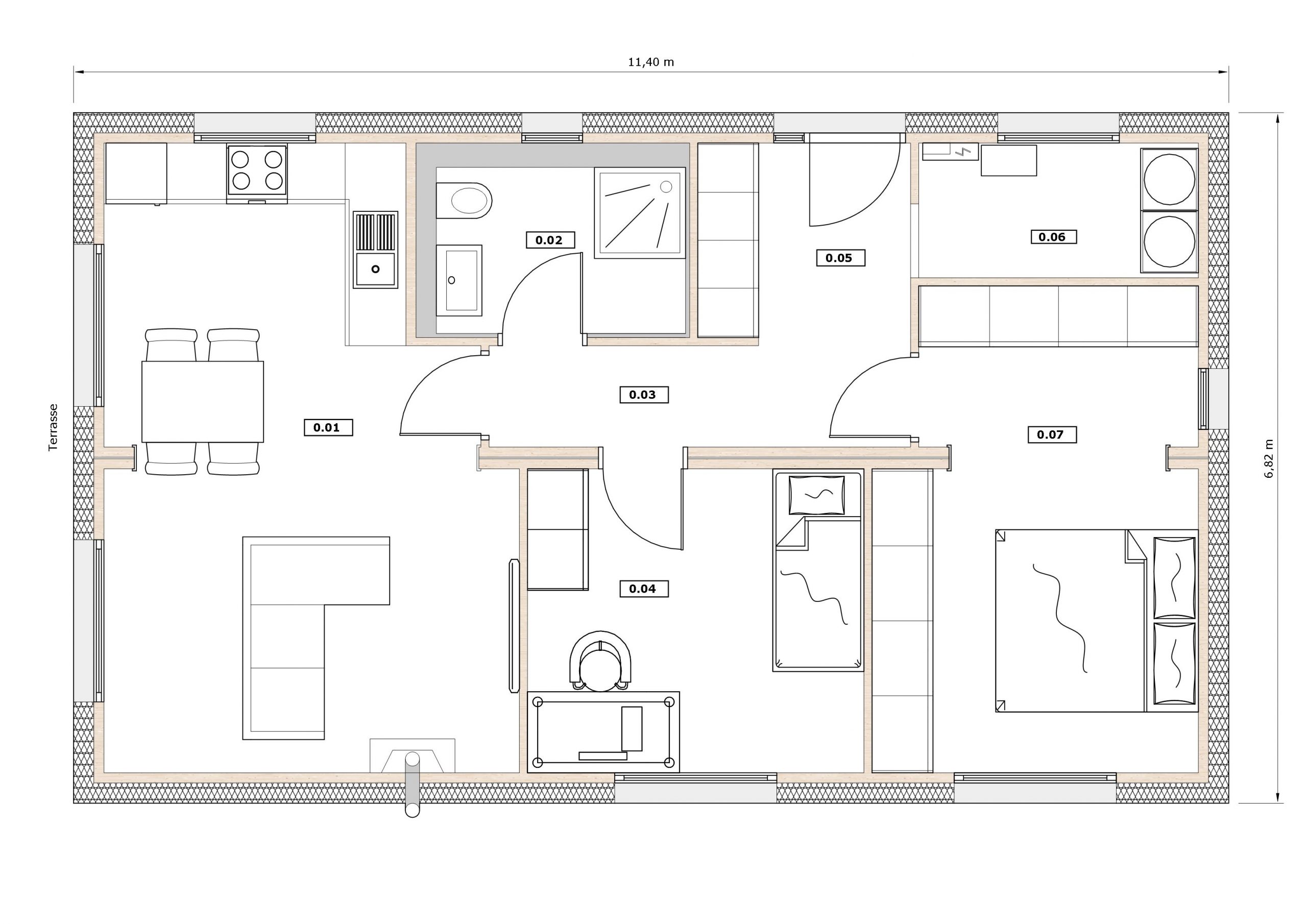 Das Modulhaus Hjort ist die optimale Wahl für diejenigen, die einstöckige Häuser favorisieren und einen kompakten Grundriss mit 2 separaten Zimmern suchen. Seine schlichte und dennoch originelle Form stellt einen bedeutenden Vorteil dar. Hier finden zwei Personen bequem Platz.