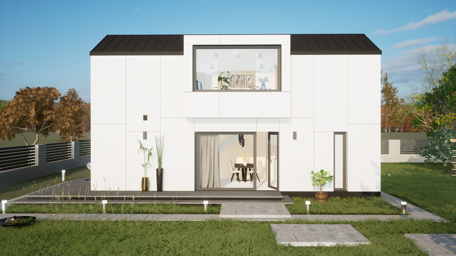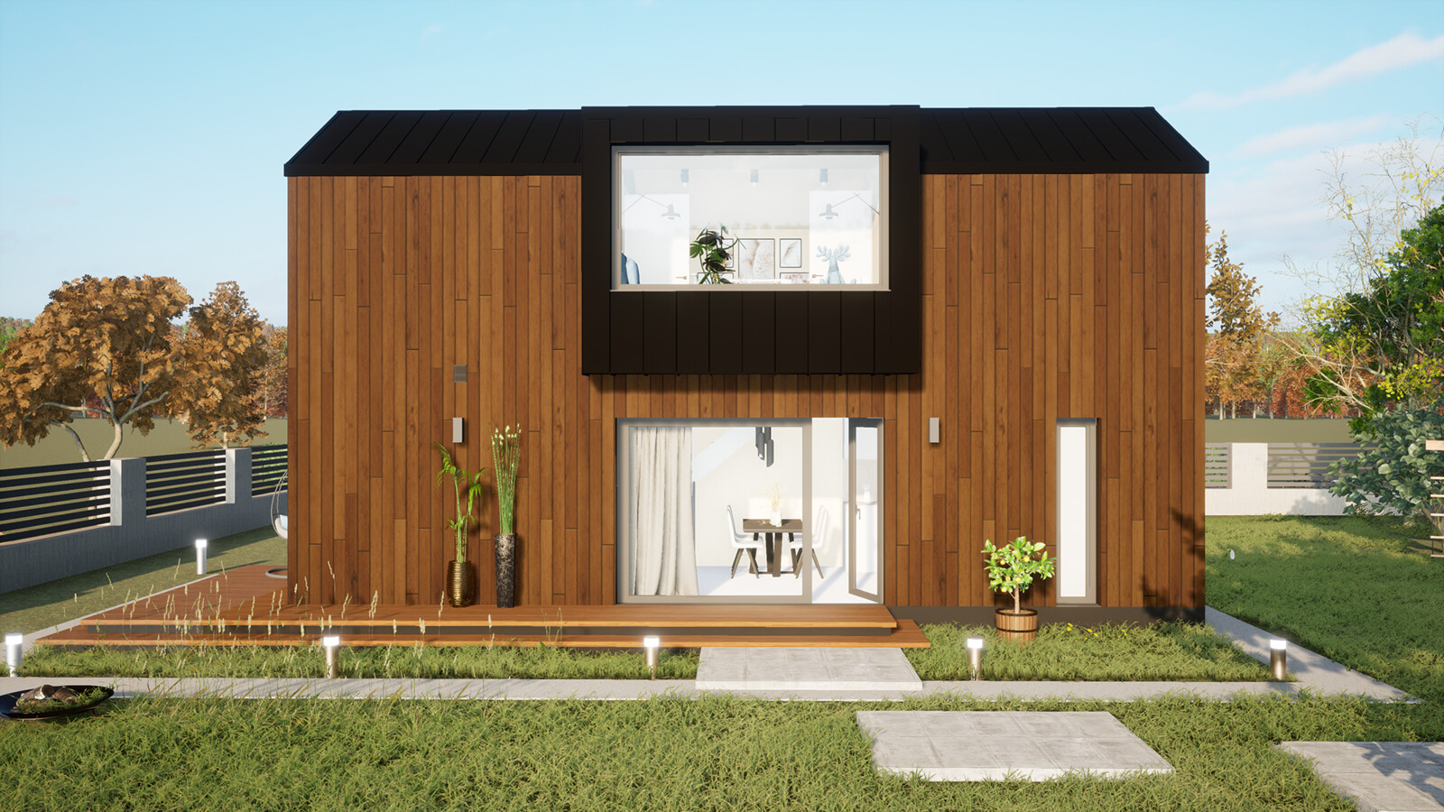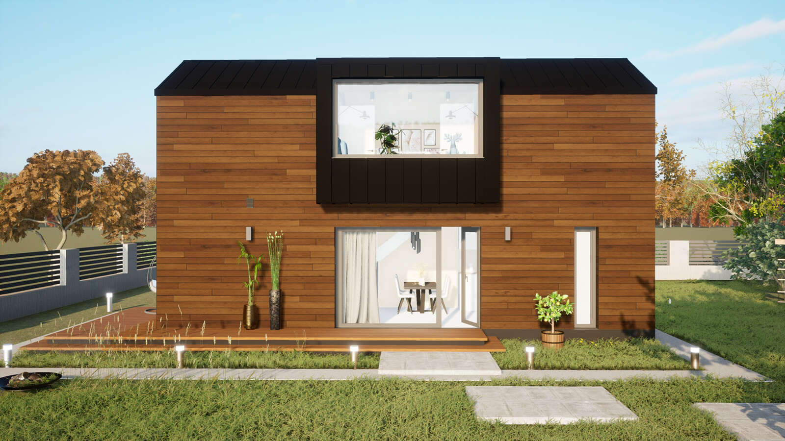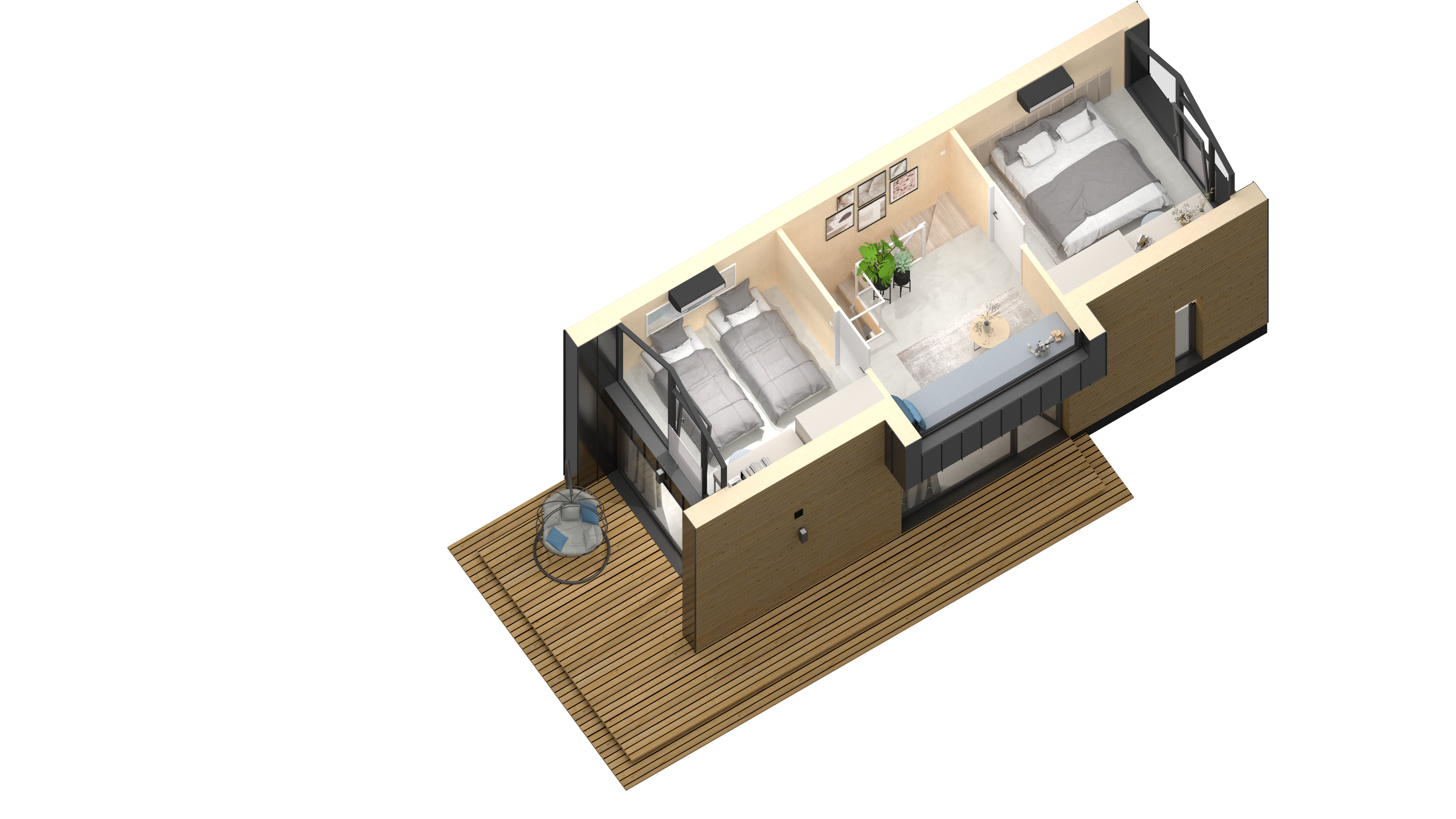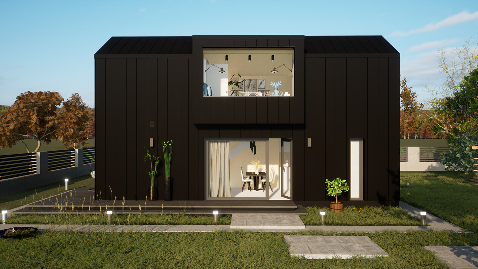 Für das Modulhaus SOL werden zwei Module übereinander gebaut mit einer zusätzlichen Dachgaube im Obergeschoss. Dies gibt dem Haus sein minimalistisches und einzigartiges Design. Es kann sowohl als Hauptwohnsitz als auch als Ferienhaus genutzt werden.
