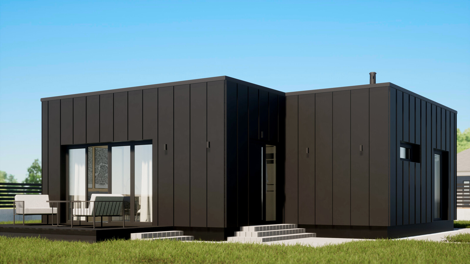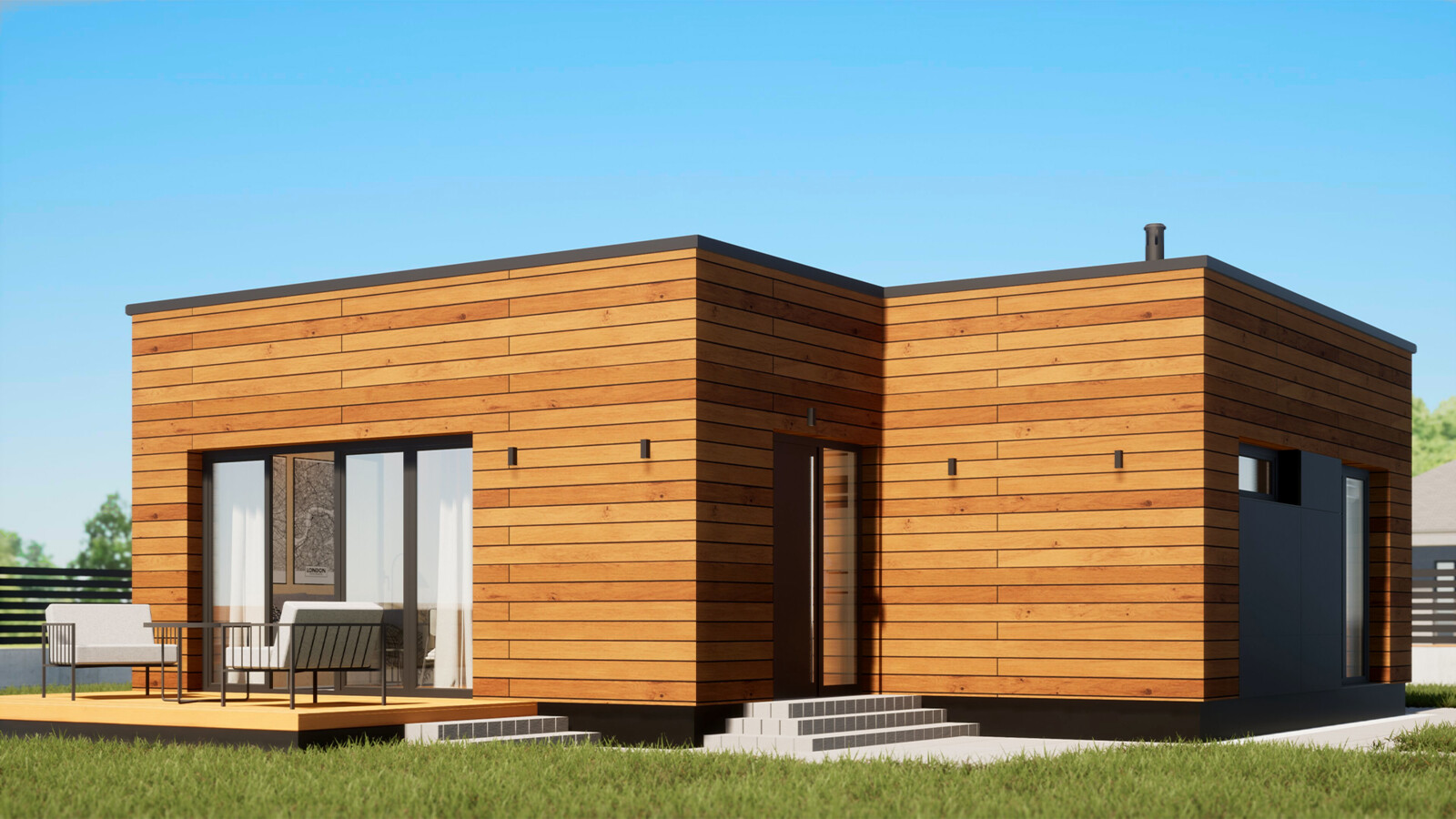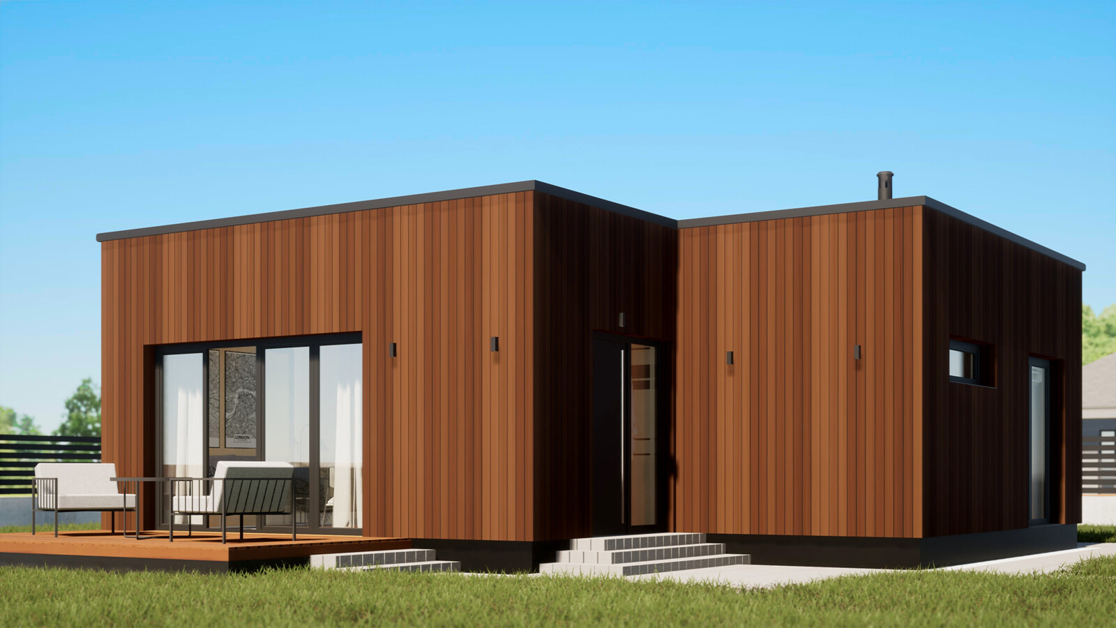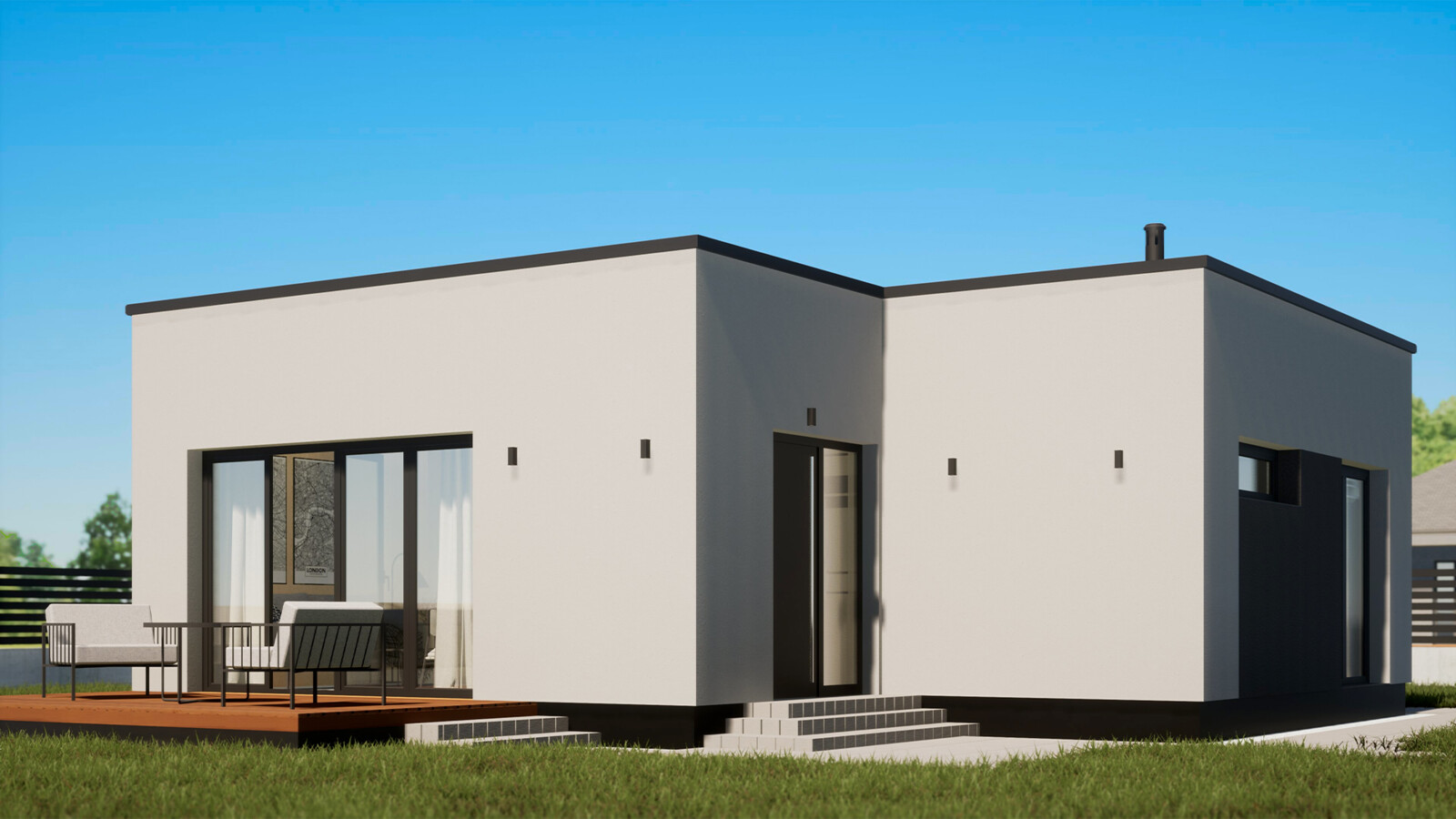 Das Modulhaus Vang ist ein komfortables, einstöckiges Modulhaus mit kompaktem Grundriss und ideal für ein bis zwei Personen. Es wird mit einem Flachdach gebaut.