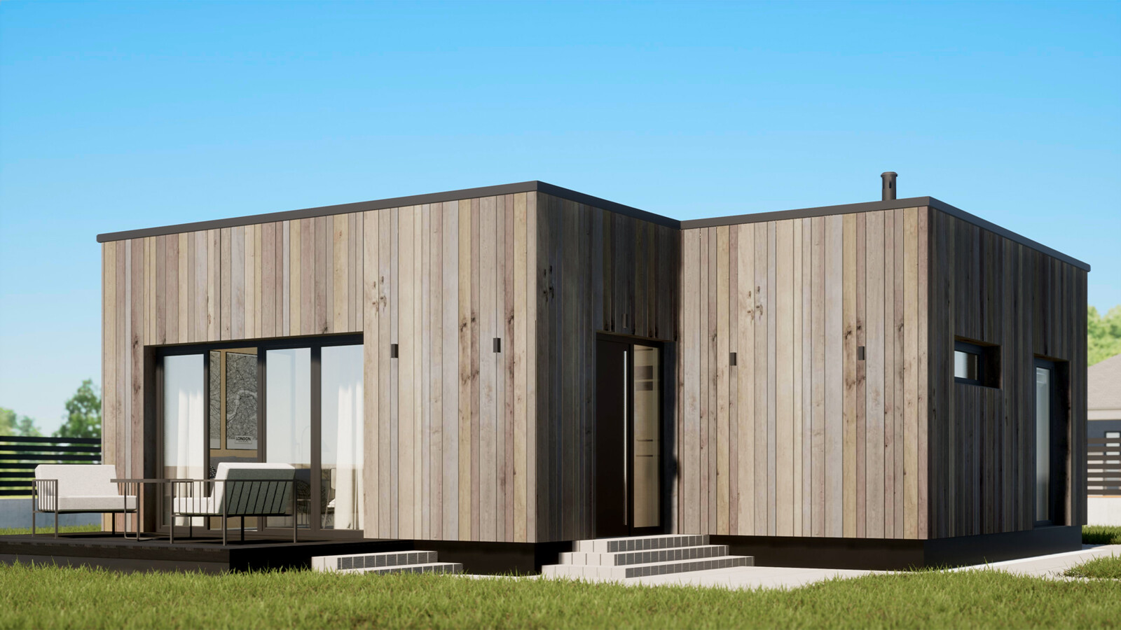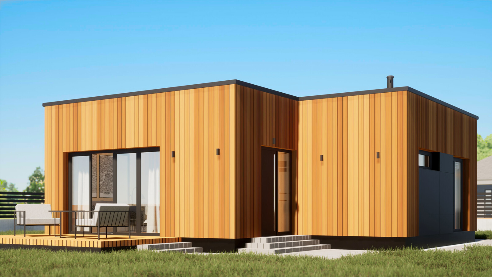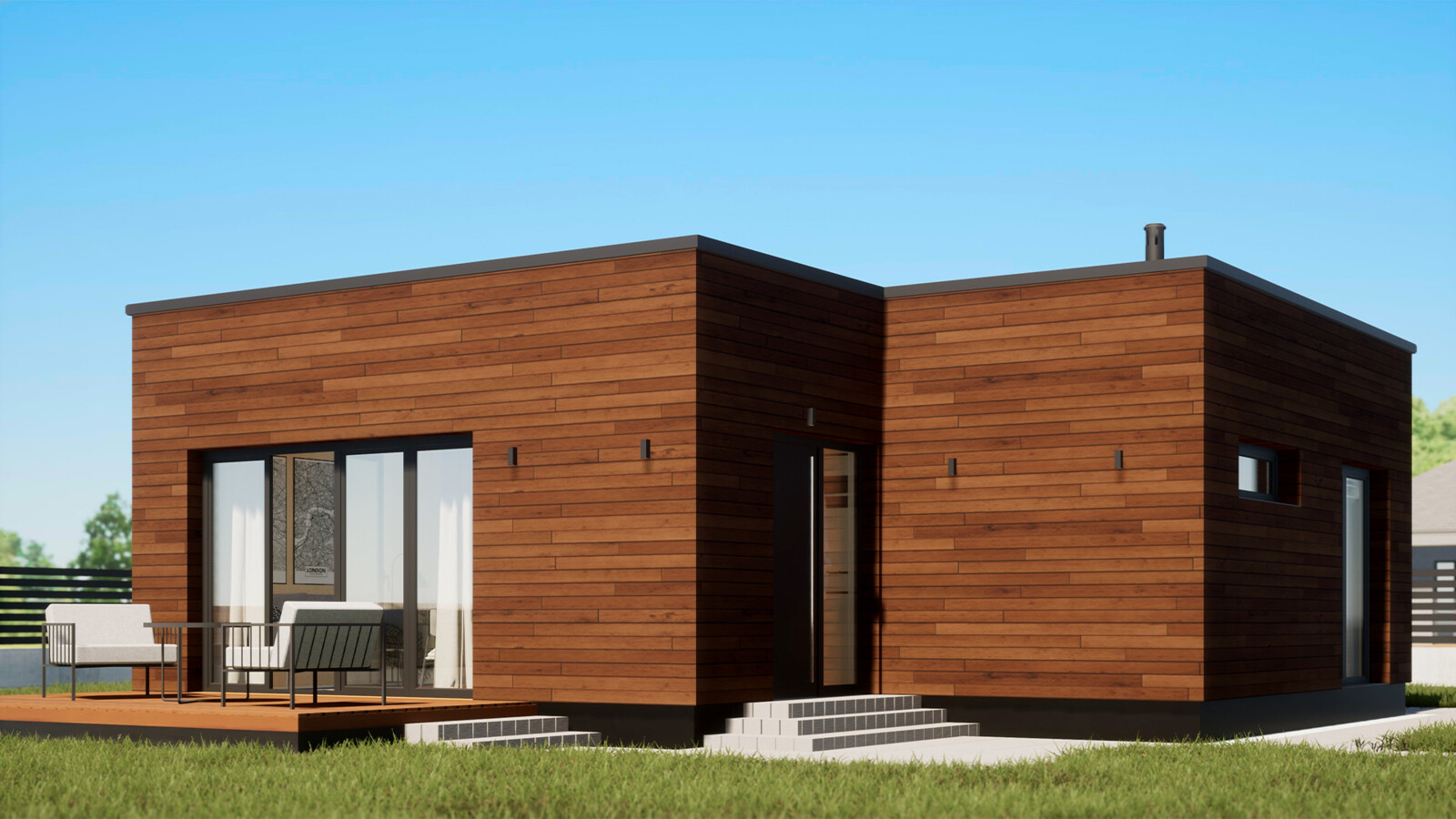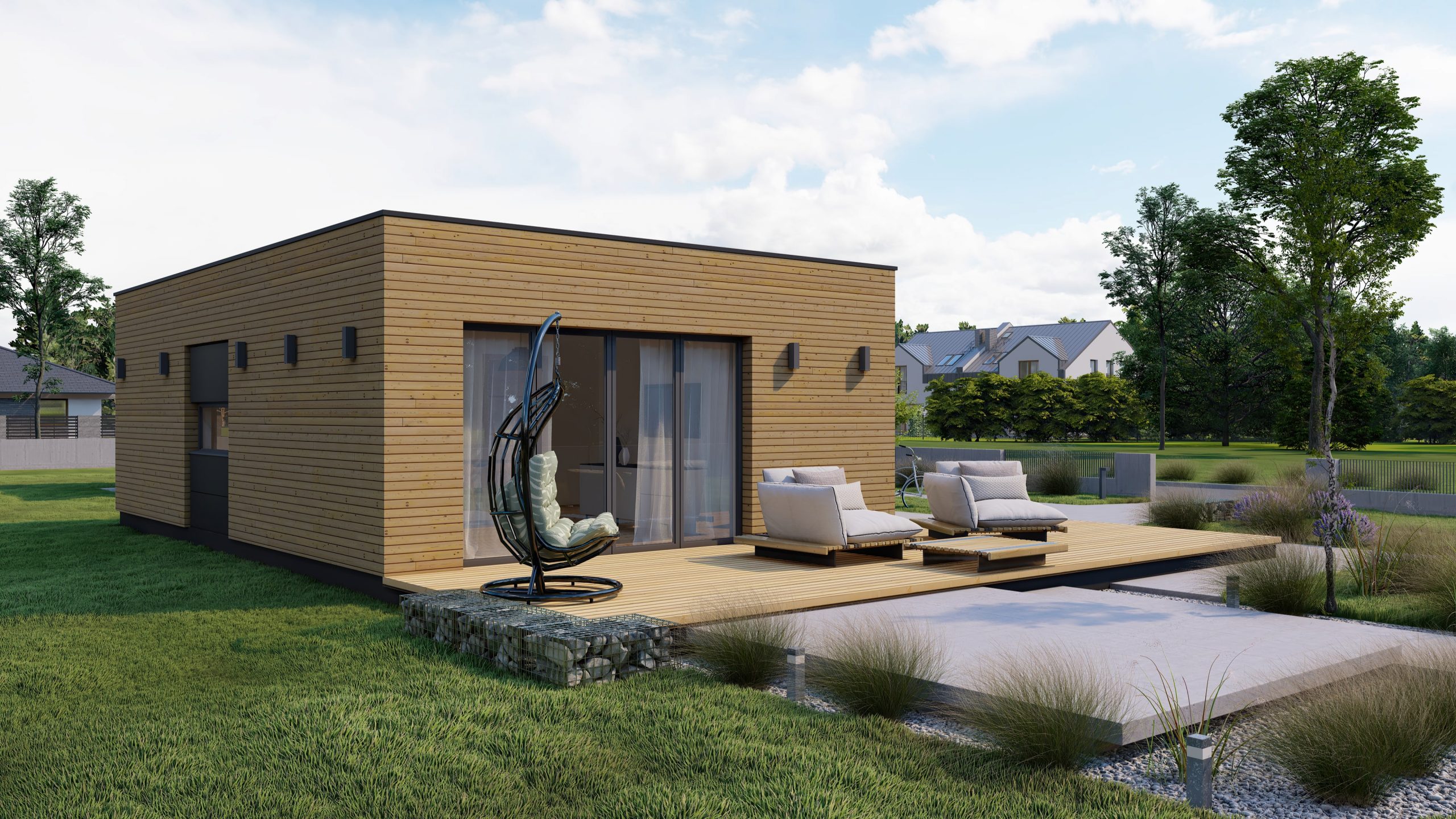 Das Modulhaus Vang ist ein komfortables, einstöckiges Modulhaus mit kompaktem Grundriss und ideal für ein bis zwei Personen. Es wird mit einem Flachdach gebaut.