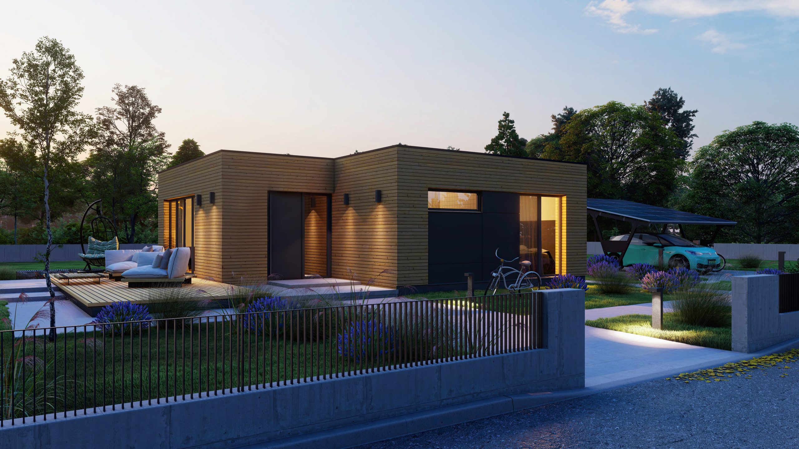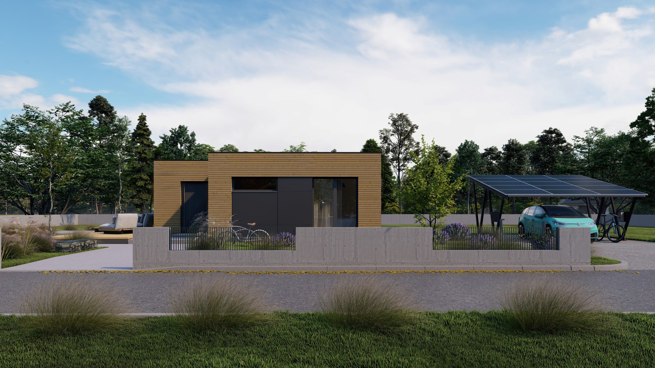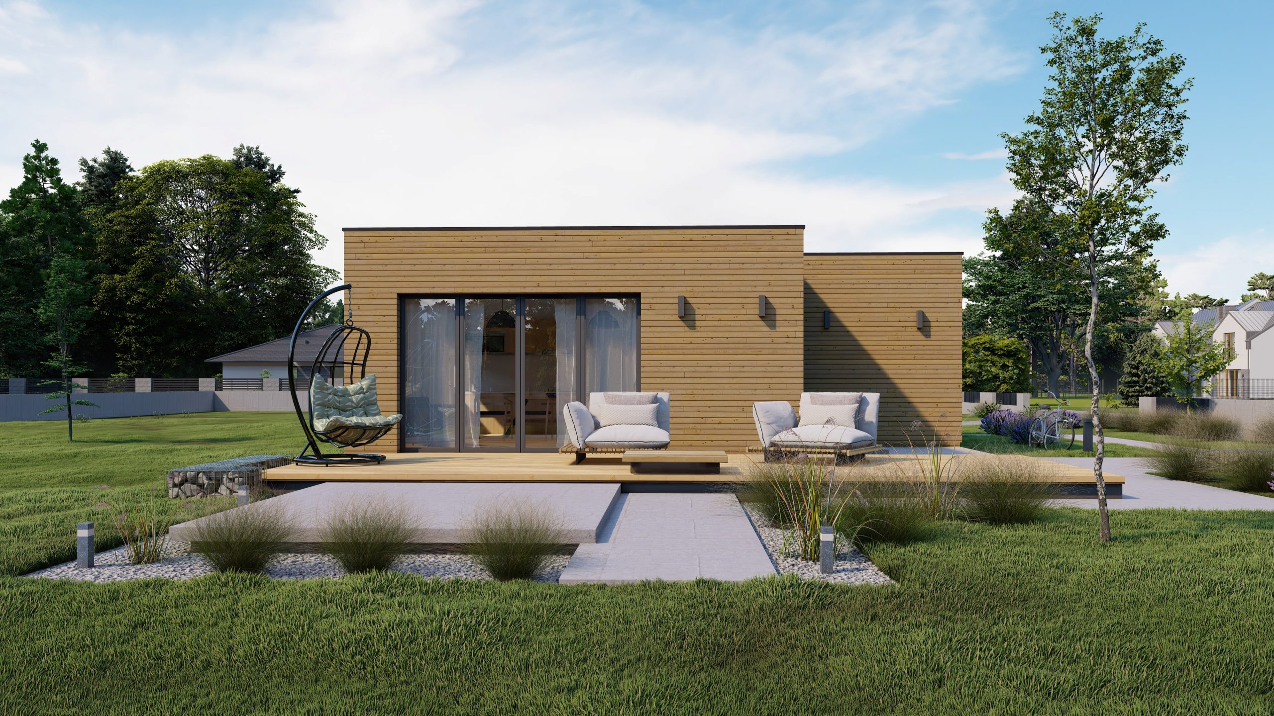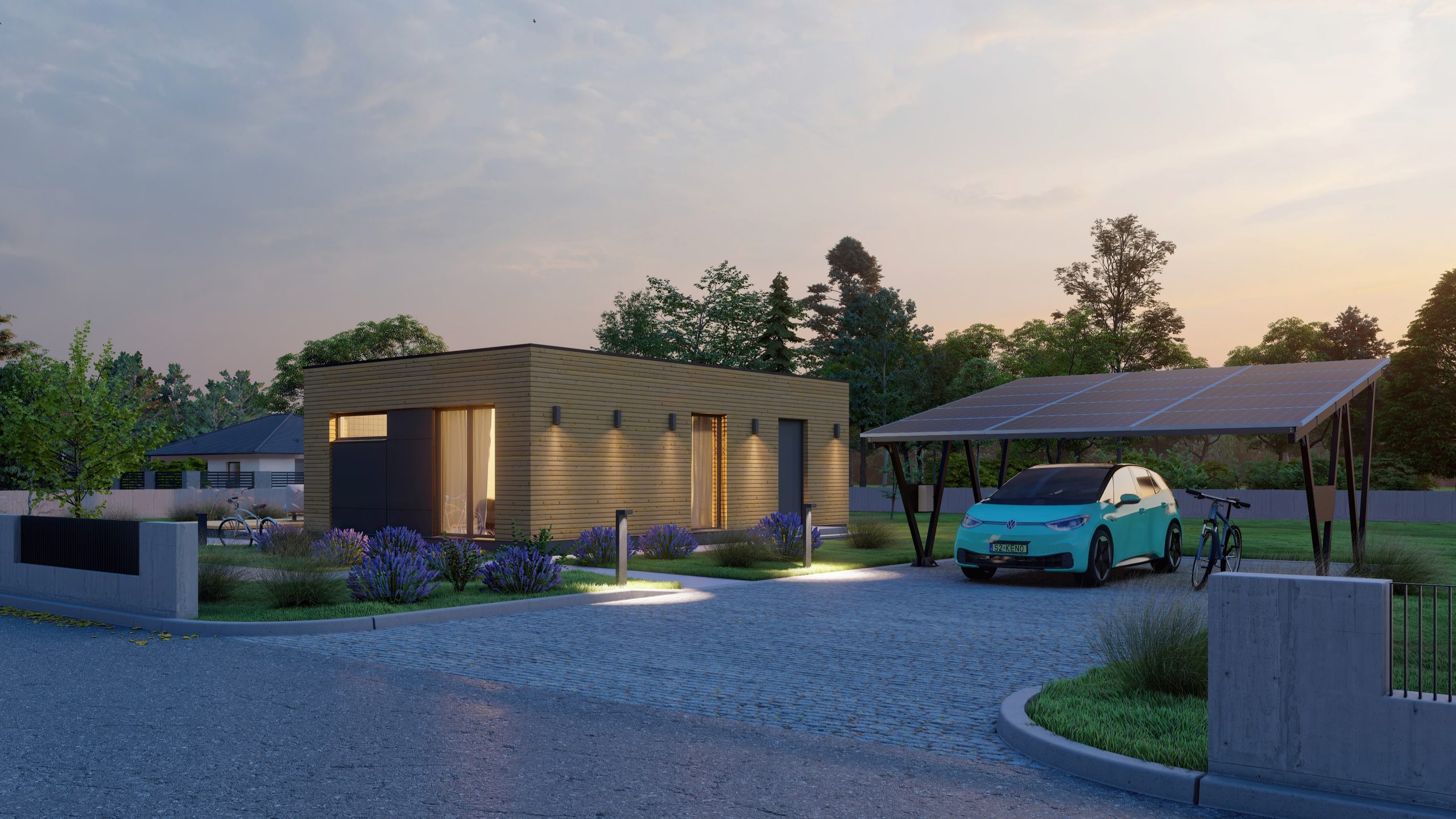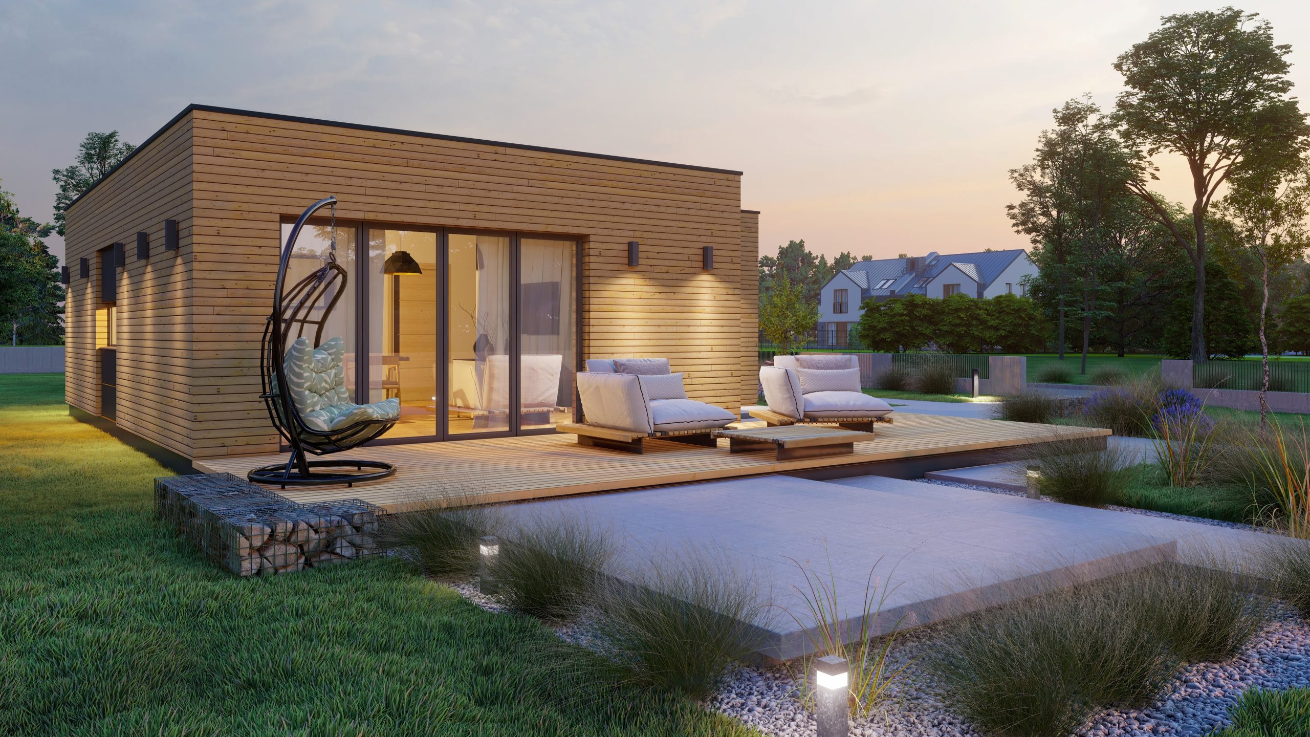 Das Modulhaus Vang ist ein komfortables, einstöckiges Modulhaus mit kompaktem Grundriss und ideal für ein bis zwei Personen. Es wird mit einem Flachdach gebaut.